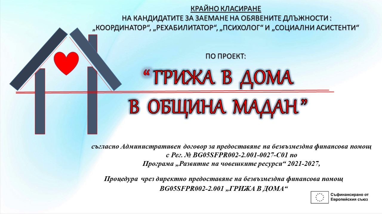 КРАЙНО КЛАСИРАНЕ НА КАНДИДАТИТЕ ЗА ЗАЕМАНЕ НА ОБЯВЕНИТЕ ДЛЪЖНОСТИ: „КООРДИНАТОР“, „РЕХАБИЛИТАТОР“, „ПСИХОЛОГ“ И „СОЦИАЛНИ АСИСТЕНТИ“ ПО ПРОЕКТ "ГРИЖА В ДОМА В ОБЩИНА МАДАН"