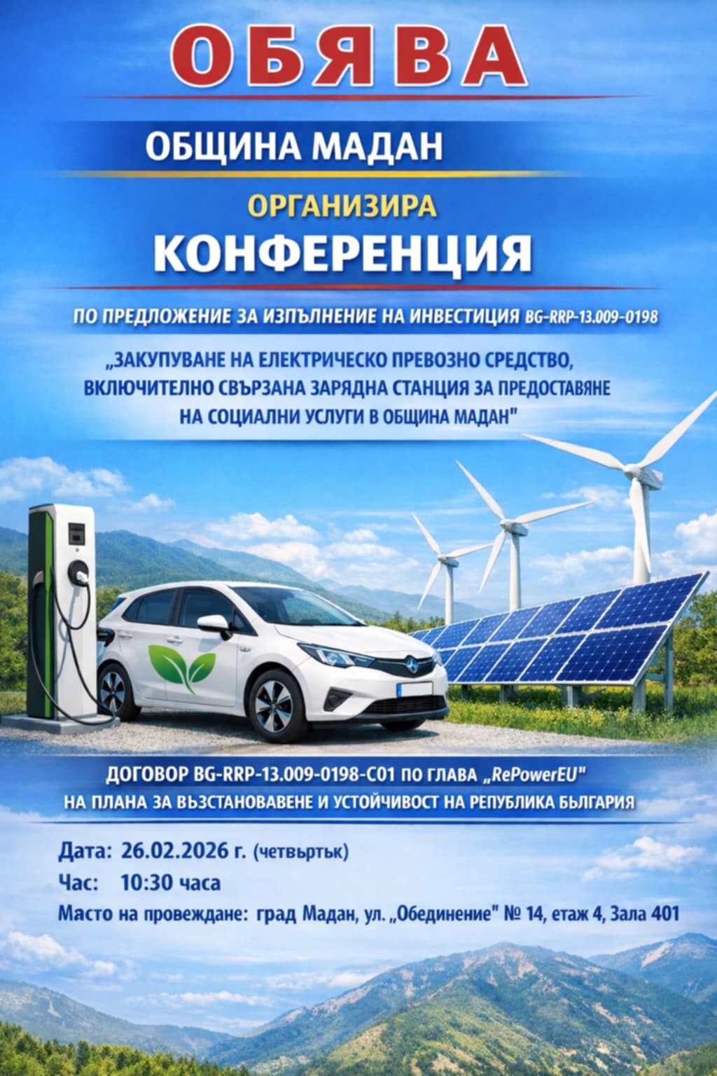 „ЗАКУПУВАНЕ НА ЕЛЕКТРИЧЕСКО ПРЕВОЗНО СРЕДСТВО, ВКЛЮЧИТЕЛНО СВЪРЗАНА ЗАРЯДНА СТАНЦИЯ ЗА ПРЕДОСТАВЯНЕ НА СОЦИАЛНИ УСЛУГИ В ОБЩИНА МАДАН“
